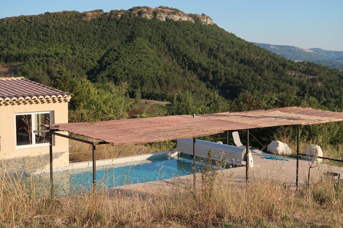 La piscine de 10 m x 4 m chauffée, vue sur la vallée et la montagne de la Chevrière sur la gauche.